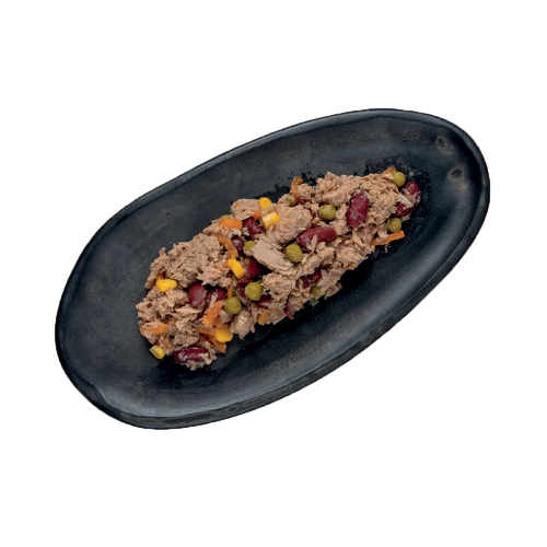 Συστατικά: Τόνος 47% [τόνος (Katsuwonus pelamis), σογιέλαιο], Φυτικό έλαιο (σογιέλαιο ή ηλιέλαιο), φασόλι κόκκινο (πιθανόν να περιέχει ίχνη από γλουτένη, λούπινο, σουσάμι, σόγια), καρότο (καρότο, ξύδι, ζάχαρη), καλαμπόκι, αρακάς, άρτυμα λεμονιού (νερό, συμπυκνωμένος χυμός λεμονιού), ρυθμιστής οξύτητας: κιτρικό οξύ, αλάτι, συντηρητικά: Ε202, Ε211. Πιθανόν να περιέχει ίχνη από σέλινο. Περιοχή αλίευσης FAO 71 Ειρηνικός ωκεανός. Αλιεύτηκε με γρι-γρι.