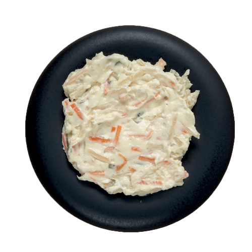 Συστατικά: Μαγιονέζα Vegan [Φυτικό έλαιο (Σογιέλαιο ή ηλιέλαιο), νερό, Μουστάρδα (νερό, ξύδι, σινάπι, φυσικό άμυλο αραβοσίτου, αλάτι, ζάχαρη, φυσική χρωστική: κουρκουμίνη, συντηρητκό:Ε211, άρωμα μουστάρδας), ζάχαρη, ξύδι, αλάτι, πηκτικοί παράγοντες: τροποποιημένο άμυλο αραβοσίτου, κόμμι γκουάρ και ξανθάνης, ρυθμιστής οξύτητας: Ε330, συντηρητικό: Ε202, αντιοξειδωτικοί παράγοντες: EDTA, εκχύλισμα δενδρολίβανου], λαχανικά σε μεταβαλλόμενες αναλογίες (σέλινο, καρότο, αγγουράκι, αλάτι, ξύδι, ζάχαρη, καρυκεύματα, αρωματικές ύλες, ρυθμιστής οξύτητας: Ε509), ζάχαρη, ξύδι, αλάτι, ρυθμιστής οξύτητας: κιτρικό οξύ, συντηρητικά: Ε202, Ε211. Πιθανόν να περιέχει ίχνη από σουσάμι.